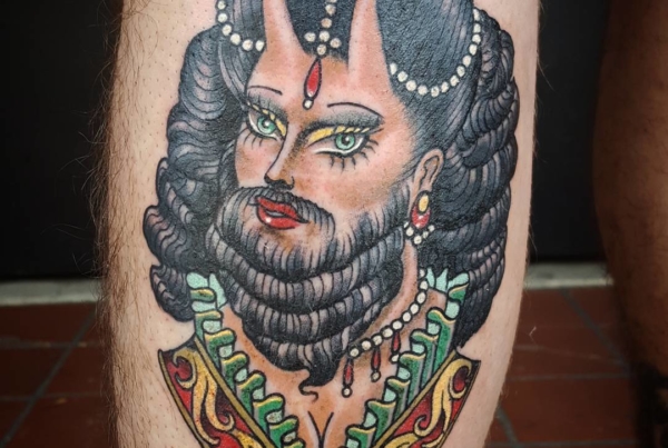 Cranked this horned bearded lady out late last night on Scott. Thanks for always bringing me awesome ideas! #beardedlady #beardedladytattoo
